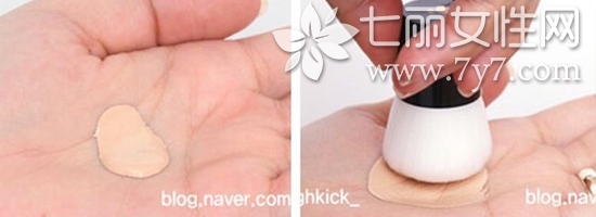 STEP3:上脸前,挤出硬币大小的粉底在手心,用小刷子在手心蘸取。