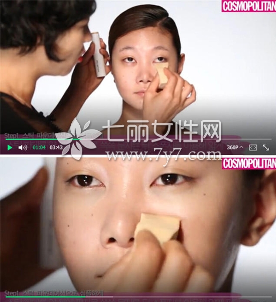 STEP1:先用粉底棒在两颊、额头等涂抹一下,然后用海绵粉扑轻轻拍打开。