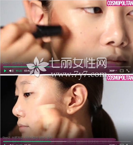 STEP3:用带有珠光的古铜色高光棒涂抹在颧骨斜向上部分,然后用粉扑轻轻拍打开。