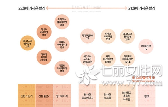 后来决定按照BB霜涂在皮肤变干后的颜色效果来判别颜色。首先是以21号颜色为基础对颜色进行了分类,大部分颜色都比较接近21号色,只有少数几个品牌的色彩比较接近23号色。有些气垫BB霜虽然是21号,但是颜色却相对较暗,如果喜欢亮色的话,可以选择使用13号气垫BB霜。