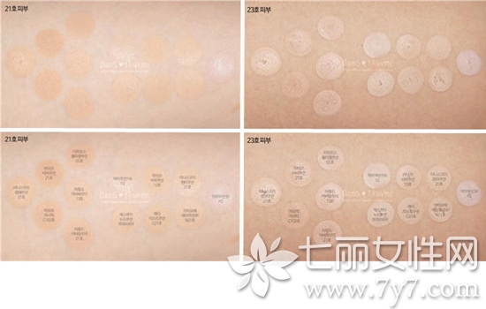 左边是比较接近21号色的气垫BB霜涂抹在皮肤上的效果;右边是比较接近23号色的气垫BB霜涂抹在皮肤上的效果;这样便可以立即分辨出哪种色号的气垫BB霜比较适合自身的肤色。