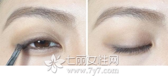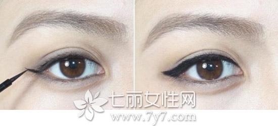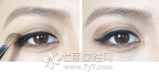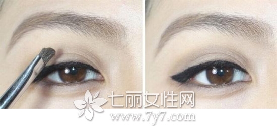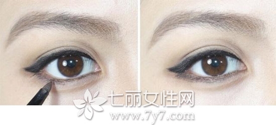 STEP8:由下眼尾向上延伸出黑色眼线作为眼线末端画上外眼线,眼尾至眼头由粗到细。