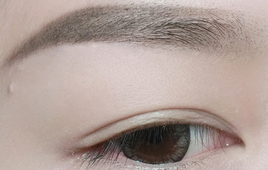 第二步:眉粉填满整个框架,眉尾颜色加深,眉笔填补眉毛空隙,再用眉粉晕染眉头,用遮瑕和粉底提亮眉骨,勾勒出清楚的眉形。平直眉是日常画的最多,也是适合多种场合的一款眉形。