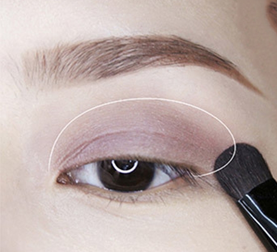 第十步:涂上眼部打底膏,用不带珠光的深紫色眼影大面积铺满眼窝,作为眼部打底。这里使用的眼影是悦诗风吟单色眼影40号色。