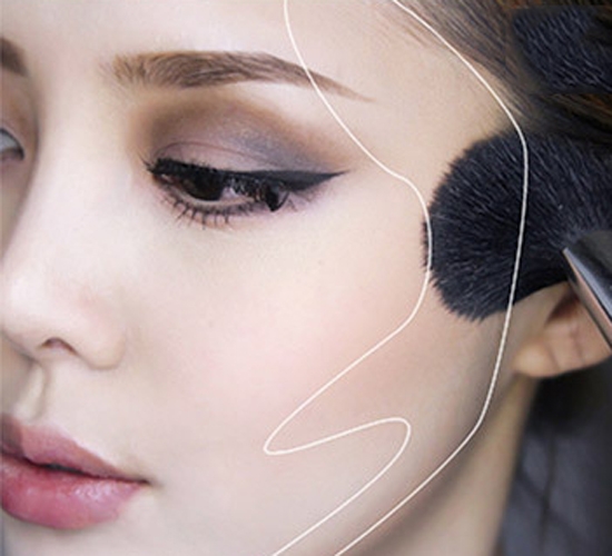 第十九步:用修容刷沾取阴影粉画脸颊两侧及颧骨下方,少量多次晕染避免色块。