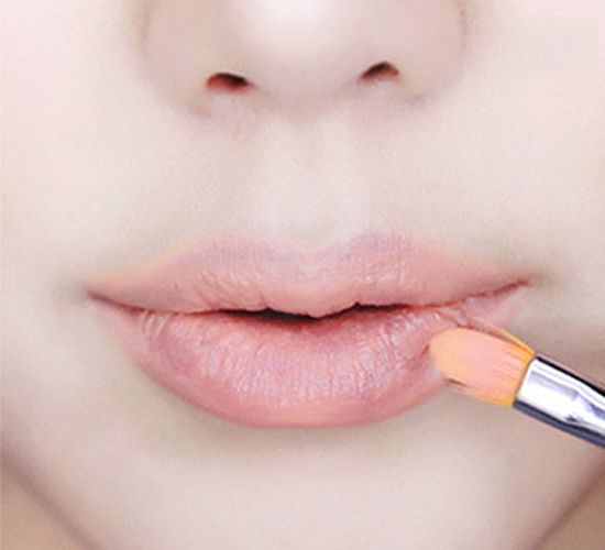 第二十步:选择不带珠光的桃子色唇膏,用唇刷涂抹嘴唇。
