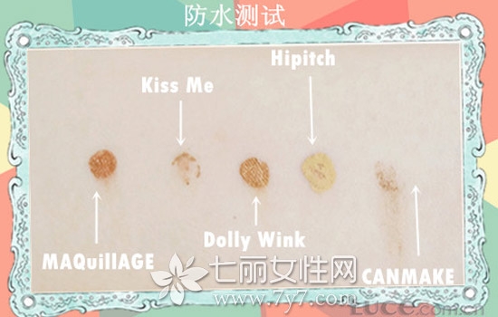 MAQuillAGE、Dolly Wink、Hipitch表现突出!防水性能很好!其余两款在防水上略输一筹。