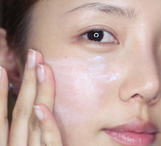 第一步:选择透明又有光泽感的粉色光泽感的妆前乳,轻薄的涂抹在脸上,今天的主色调为紫红色,带点粉色的底妆会起到更显气氛的作用。这里使用的是自然乐园的CC霜。