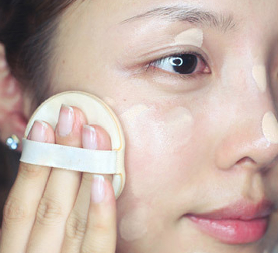 第二步:底妆完成后就是BB霜了,为了铺垫表现出有质感的肌肤,筛选出保湿效果强的彩妆产品,大概25px作用用手指涂在脸上,用气垫粉扑将BB霜轻薄的涂在脸上。这里使用的BB霜是爱丽小屋的珍珠亮白BB霜。