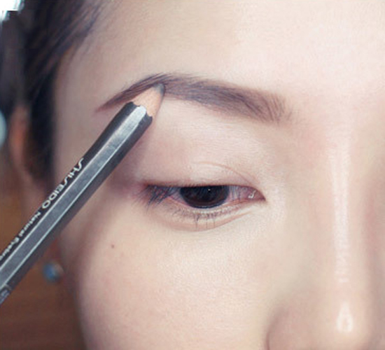 第一步:选择深棕色的铅笔眉笔完成眉毛,这里眉笔颜色是深色系,和发色没有违和感。这里使用的是资生堂自然眉笔BR602.