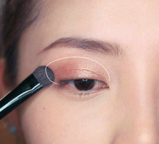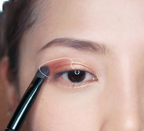 第四步:选择带橙色光泽的珠光眼影刷在眼窝后半部分,从后向前来回刷。这里使用的是MAC单色眼影casino。