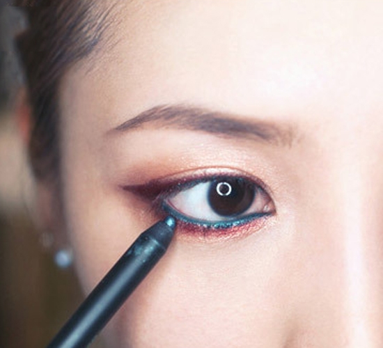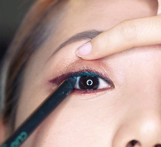 第十一步:使用孔雀蓝色眼线笔再一次沿着睫毛根部画内眼线,画眼头处的时候注意不要晕染。这里使用的是CLIO眼线胶笔2号色。
