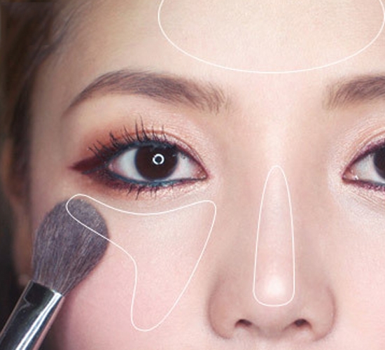 第二步:选择带珠光的高光粉饼作为高光产品,刷在脸部的额头、鼻梁、脸部中央。这里使用的是悦诗风吟10号。