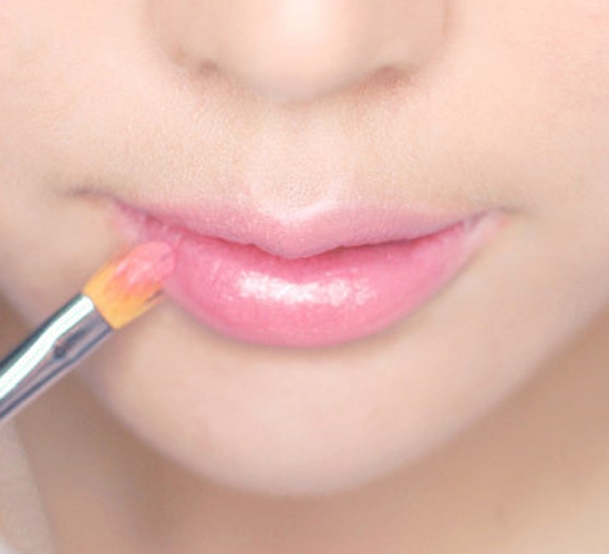 第三步:选择蜜桃色的唇膏刷在嘴唇处,想要唇妆有好的效果,就先给唇部打底哦。用手指将涂好的唇膏涂抹均匀,选择不带珠光但十分显色的粉色唇膏用唇刷涂满整个嘴唇。