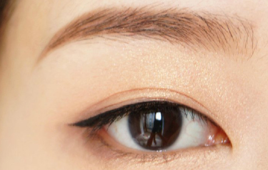 第五步:用眼线膏画眼线,眼球上方尽量画细一些,眼尾平拉出去,不要过长,稍微延伸即可。这是刘亦菲眼妆最关键的一步,拉平眼线会显得眼神仙气十足。这里使用的是美宝莲黑色眼线膏。