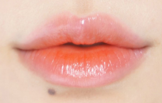 第九步:刘亦菲的唇形偏圆润,淡淡自然提气色的唇色,所以我们将橘色的唇彩画满整个唇部,将深一色号的唇彩画在下唇中央,用唇刷晕开。上唇中央也用唇刷晕开。