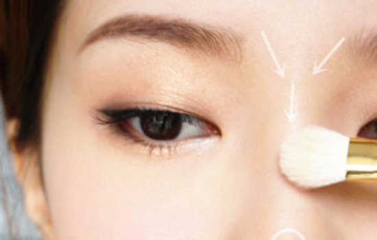 第七步:用上一步骤的刷子沾取高光粉,刷在眉尾下方,提亮眉弓眼头。这里使用的高光粉是梦妆高光粉。这样子做的话,可以加强立体感。