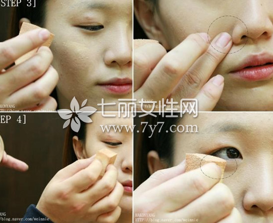STEP2:上粉底的时候,千万别遗漏了鼻翼、眼周、嘴角这些容易忽视的地方。
