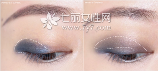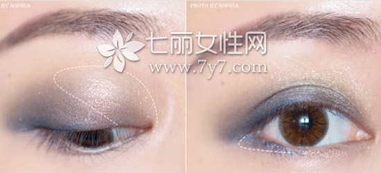 STEP1:用中号眼影刷取蓝色眼影,晕染眼尾半部分,范围不要超过双眼皮褶皱外;