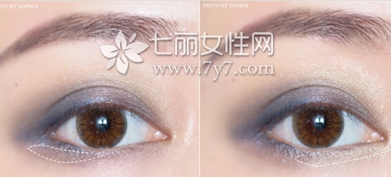 STEP4:用小号眼影刷取蓝色眼影,轻轻带过下眼尾;