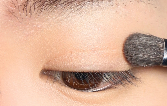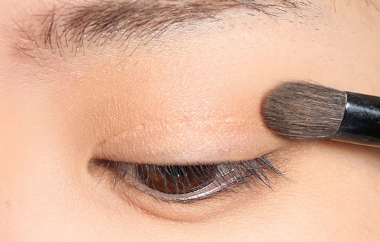 第三步:眼影一定要用亚光的,一点珠光都不要带,先用一个接近肉色的眼影给整个上眼皮打底。