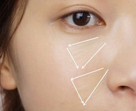 第二步:气垫粉底的遮瑕度不如传统的粉底液,所以这里我们需要用遮瑕膏遮掉脸部瑕疵。这里使用的是IPSA三色遮瑕,最浅色提亮眼下和法令纹处。