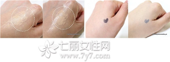 质地轻薄,含有较多保湿成分,颜色比较亮丽;先在手上用眼线笔画了个心形图案,涂上气垫粉底后,黑色的心形图案不再那么明显,从侧面反映了产品遮瑕力还是不错的。