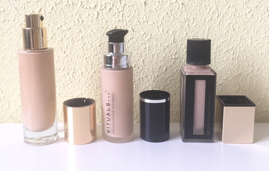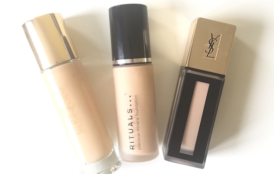 圣罗兰粉底液在彩妆界中一直非常出名,最出名的两款便是下面的圣罗兰超模聚焦粉底液、圣罗兰完美哑光粉底液。为了增加对比,小编这里加入了rituals的仪式纯净矿物粉底液。