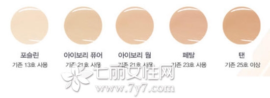 粉底液一共有5个色号:Porcelain色,相当于13号色,适合皮肤很白者使用;Ivory pure色,相当于21号色,适合皮肤偏白者使用;Ivory warm色,相当于21号偏粉色,适合皮肤偏白者想要粉嫩自然感的使用;Petal色,相当于23号色,适合自然皮肤使用;Tan色,相当于25号色,适合小麦色肌肤者使用。