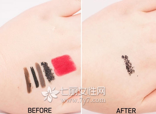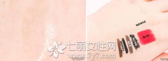卸妆水质地就是水,然后作为卸妆类产品,清洁力度也是关键。在手背上涂上粉底液、防水眼线笔和液、眼影、防水睫毛膏、大红色唇膏,用来测试卸妆力度。