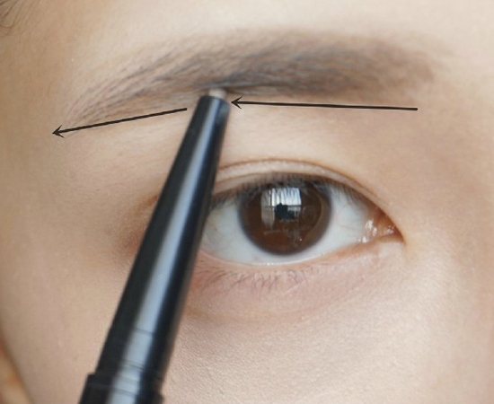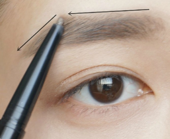 第二步:修眉后,先用眉笔的那头画眉毛下缘,线条尽量画直一些,如果画不直,可以现在手上或纸上练一练哦。这里使用的眉笔是美宝莲双头多用塑形眉笔。