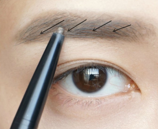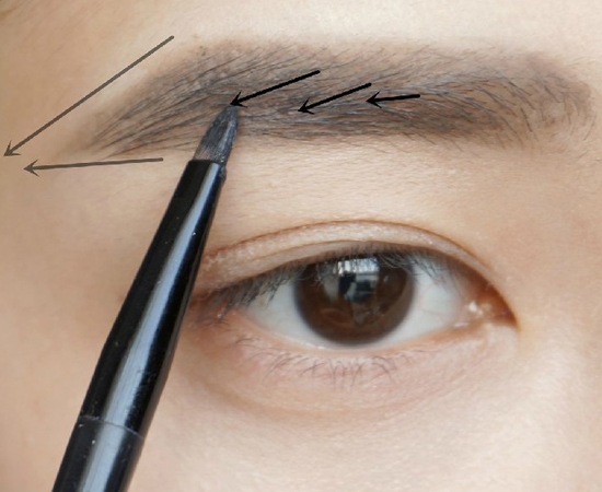 第五步:眉妆的最后一步,刷子沾取少量眼线膏轻轻加强眉中眉尾,按照图中所示的方向描画,轻轻地。这里使用的眼线膏是美宝莲眼线膏黑色。