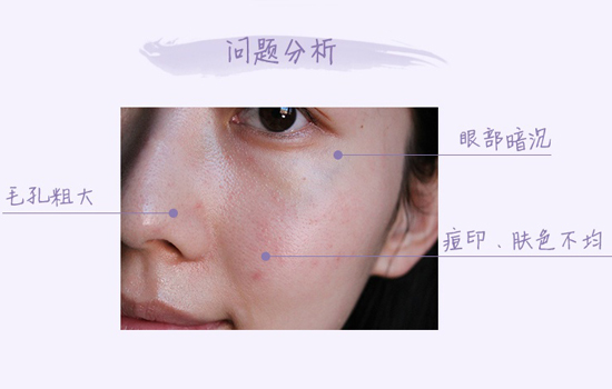 从图中可以看出,皮肤毛孔粗大,眼部暗沉,并且有痘印,肤色不均。想要打造完美底妆的话,需要三种产品。一,需要毛孔打底霜,平滑肌肤。二,强遮盖力和自然肤色的粉底。三,提亮塑造立体轮廓质地水润的遮瑕。