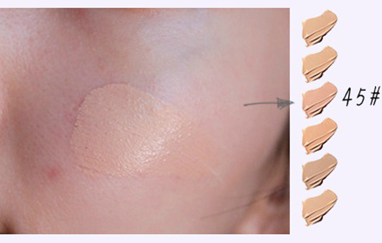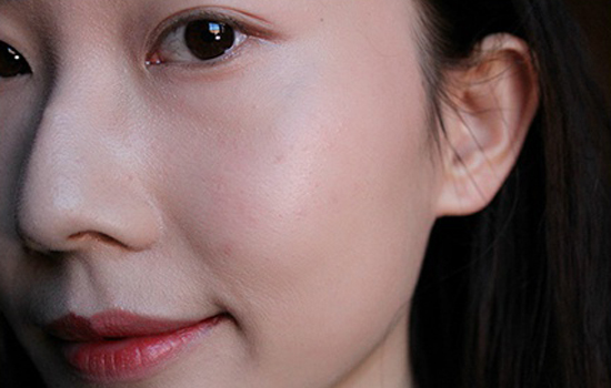 第二步:选择比自己肤色深一点的粉底,用打湿后的海绵直接沾取粉底霜,然后再涂抹在脸颊两侧和发际线位置,痘印处用余粉轻轻拍过,做简单遮瑕,这里使用的产品是蜜丝佛陀的粉底霜。