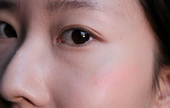 第四步:腮红膏会像皮肤透出的气色,秘诀是少量点在颧骨位置,快速用指腹拍开再用海绵按压。这里使用的腮红是canmake腮红膏05.