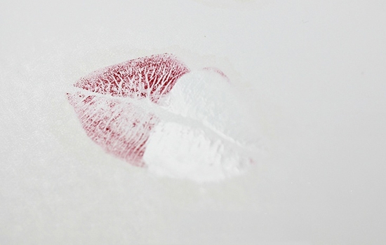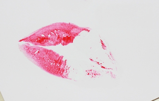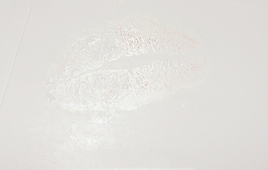 用纸在嘴唇上印一下,这一次雨衣擦多了,所以在纸上留下明显的透明的雨衣痕迹,右侧没有擦雨衣的留下明显的唇膏印。