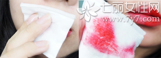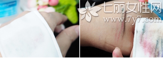 然后将沾满卸妆液的化妆棉敷在需要卸妆的手上,按压几秒钟一抹,就可以把手上的彩妆才擦掉啦。这里小编分别涂抹了口红、眼线笔、眼影笔等彩妆用品。