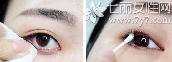将刚刚用过的化妆棉对折清洁下眼睑上的眼影,眼线部分用棉签沾取卸妆液清洁即可。