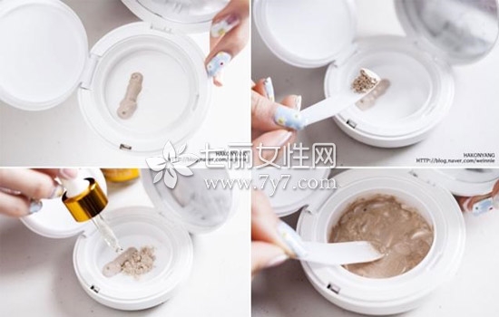 STEP1:依次在粉盒里加入:BB霜适量、散粉一小勺、精华油1管,然后用搅拌棒搅拌融合。用量的多少可能无法第一次就把握,可以慢慢增加,多试几次就有经验了。