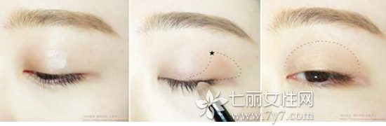 STEP3:涂抹上眼部打底霜,将浅棕色眼影涂抹在中图标示的上眼睑尾端,在用金棕色在上眼睑晕开。