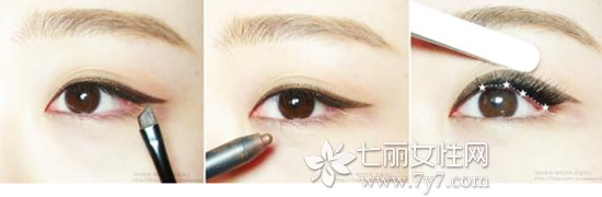 STEP5:眼尾用刷子略加晕染,紧贴黑色眼线画上巧克力色眼线并在末端拉长