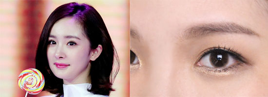 本次仿妆是杨幂在《怦然星动》发布会的妆容,眼妆很日常哦。这款眼妆的特点在于,首先是很圆的宽双眼皮,棕色沉色系眼影,黑色眼线很短稍下垂,眼尾稍稍拉长,眼头眼中卧蚕位置的亮片已经簇状的假睫毛。