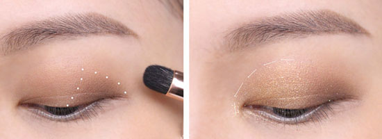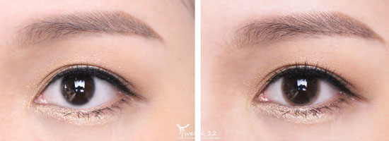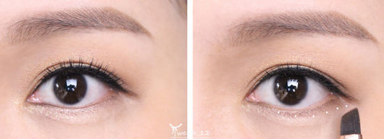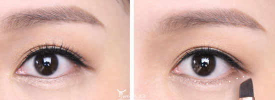 第六步:在刚画过香槟色眼线的位置再次叠加亮片眼影,以及卧蚕的位置。最后一步,佩戴小直径的棕色或黑色自然美瞳打造甜美眼神。但在这里需注意的是,正常的化妆顺序是先佩戴美瞳在画眼妆。