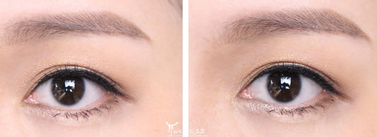 第三步:选择黑色的眼线胶笔画内眼线以及填补好睫毛空隙,杨幂的双眼皮很圆且眼头的位置比眼尾的要宽,所以双眼皮位置是眼头朝上眼尾下压。这是使用的产品是dollywink黑色眼线胶笔。