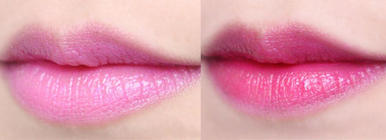 第七步:首先薄涂一层荧光粉色,用唇刷晕开,作为整个唇妆的底色。再在唇中厚厚点上品红色,后用唇刷稍微处理两色交叉处即可。这是使用的是兰蔻361M、兰蔻368唇膏。