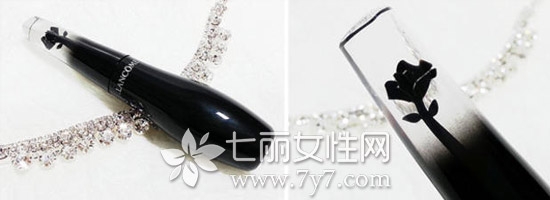 产品实物图,睫毛膏瓶身或似珍贵配件或似艺术品,凹凸有致的曲线宛如融合设计与美观的奢华珠宝。巧妙渐层的深黑色外衣,呈现前卫又神秘的氛围。作为兰蔻标志的玫瑰如同精雕细琢的幸运坠饰,以半透明方式呈现;细致优雅,摇曳生姿般的栩栩如生,仿佛自刷柄中生长而出。
