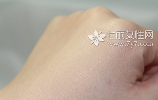将粉底顺着同一方向轻轻推匀,推匀后,在手法上就要慢慢将“推”转为按压,把“推”产生的不均匀纹理压匀,温掌法让粉底更服帖紧致。右图手背的右边,涂过粉底液,肤色均匀。