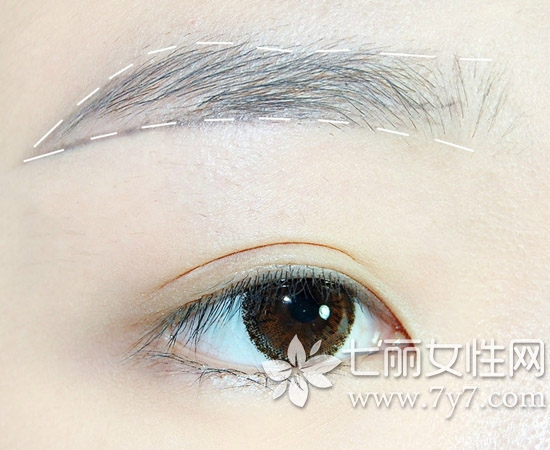 第一步:底妆后,简单修理一下自己眉毛附近的杂毛。首先用灰色的眉笔给我们要画的眉形勾边,在这里用灰色会很自然不突兀哈。眉形偏平,眉峰圆润,眉尾下拉。