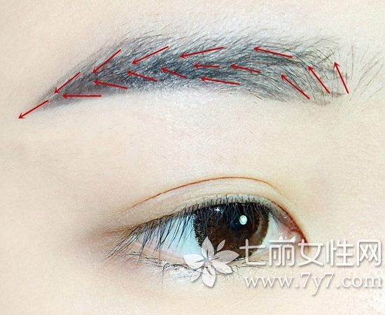 第二步:换黑色的眉笔,按照眉毛生长方向,用笔尖勾勒一根根的眉毛效果。过程中不必太仔细,总体看着舒服即可。最后,用一把螺旋刷梳理眉毛,使刚刚画的线条融于一体,整个眉毛画好,自然大方。