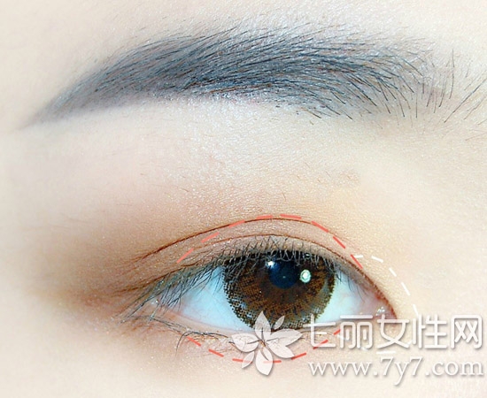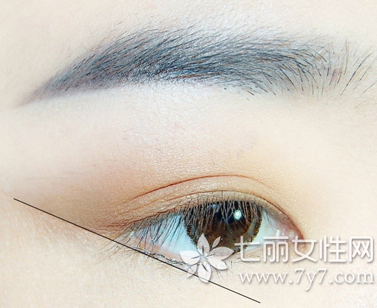 第三步:画好眉毛后,为了方便眼影打底,建议大家在如图黑线位置用一截胶带贴住眼尾,之后在上眼皮大面积打底哑光浅棕色眼影,这样的晕染方法很有古典韵味。